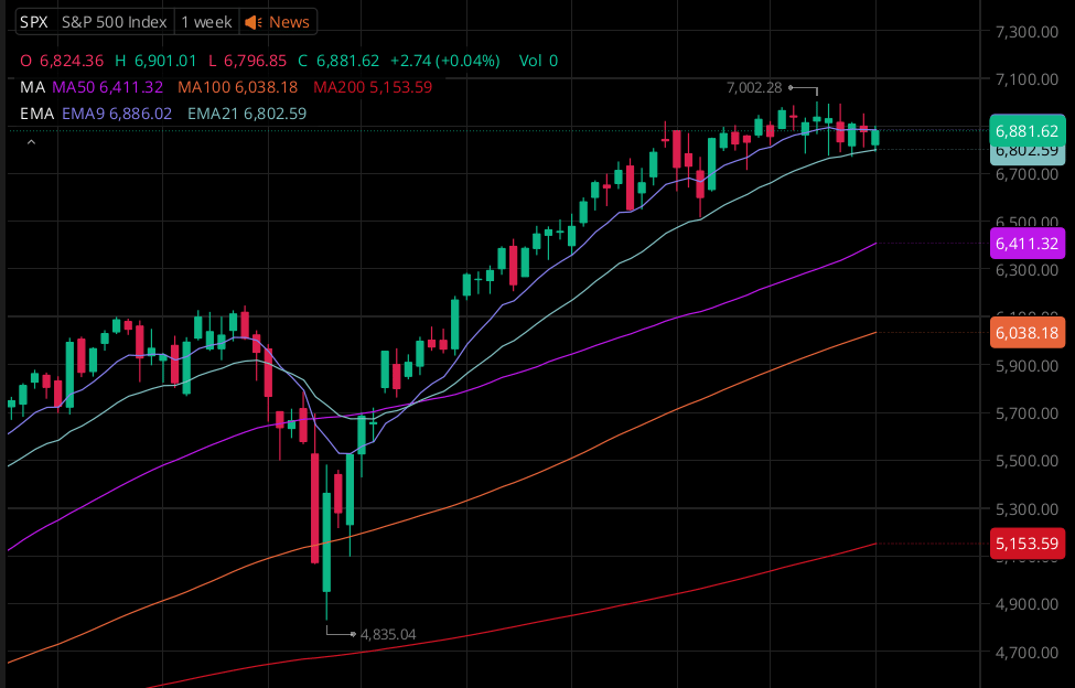 Structure is intact for now. The 21-week moving average is holding across major indices. Lose that support and the next support is meaningfully lower.