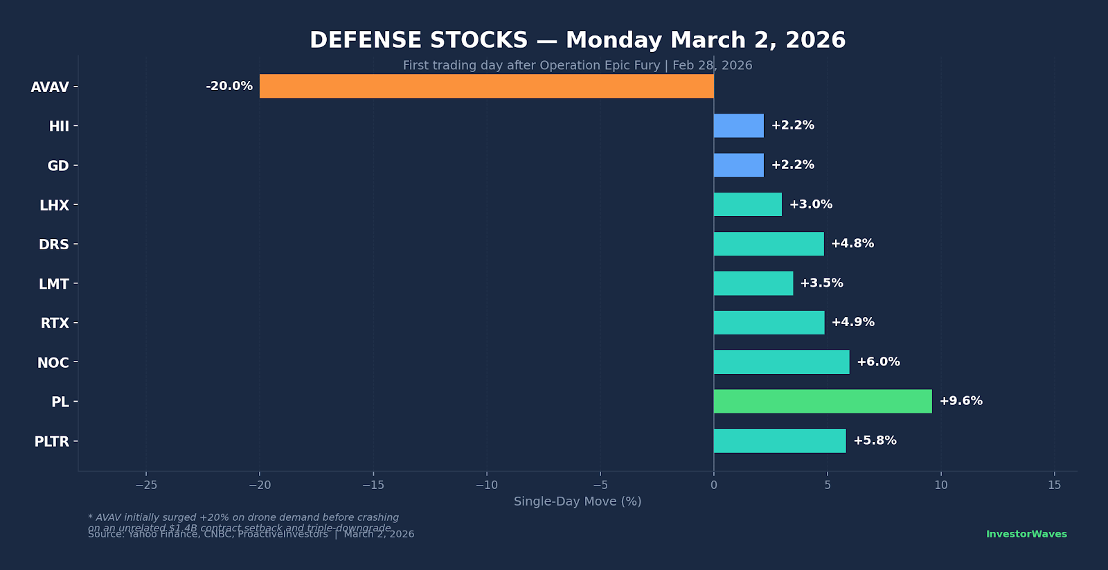 AVAV's candle on Monday was brutal. The stock initially surged 20% on drone demand expectations, then crashed after Raymond James downgraded it based on concerns that its backlog could shrink as the US Space Force recompletes a large program. A 40-point intraday swing unrelated to Iran. It is a reminder that individual company risk does not disappear just because a sector is rallying.