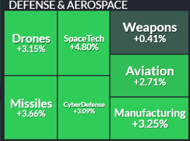 Every major defense and aerospace theme on the heat map was green on Monday: drones, missiles, space tech, aerospace. One name that bucked the trend was AeroVironment ($AVAV)
